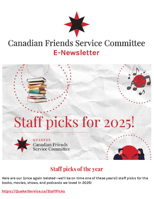For more than 50 years CFSC has put out a newsletter called Quaker Concern three times a year. It shares stories, updates, and calls to action and is available in both print and digital formats. Read it online at https://QuakerConcern.ca, donate to get a print subscription as our thank you, or click below for the most recent issues in PDF.Quaker Concern newsletter