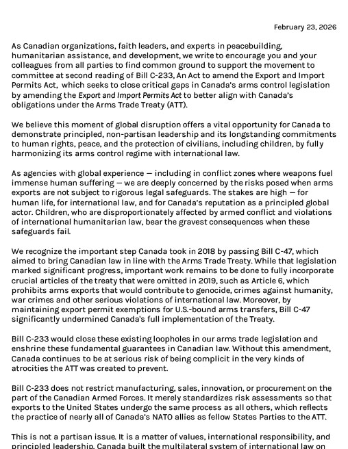 Open letter on Palestinian children in Israeli military detention. (2022) Joint statement from Quaker agencies on the Quaker peace testimony and Ukraine. (2022) Open letter in support of Hassan Diab and changes to Canada’s Extradition Act. (2022) Open letter expressing concerns over housing demolitions in Masafer Yatta. (2022) Joint statement on the need for NATO to reduce the risks posed by nuclear weapons. (2022) Blog post on possible alternatives to a military response following Russia invading Ukraine. (2022) Open letter sent before Russia invaded calling for Canada to pursue diplomacy re: Ukraine. (2022) Open letter calling on Canada to stop transferring arms to Saudi Arabia. (2021) Open letter calling for military carbon emissions transparency and cuts. (2021) Joint statement on International Day of Peace calling for new global partnerships to strengthen peace and inclusion. (2021) Open letter to federal party leaders calling for a shift to a shared security paradigm. (2021) Open letter to the Canadian Broadcasting Corporation on their coverage of Palestine/Israel. (2021) Open letter calling for a moratorium on apparently Islamophobic audits by the Canada Revenue Agency. (2021) Open letter expressing dismay at potential war crimes committed in Gaza. (2021) Open letter urging Canada to condemn demolition of Palestinian homes in East Jerusalem. (2021) Open letter applauding efforts to address online hate and calling for these not to include the flawed IHRA. (2021) Open letter asking what Canada is doing to see that Mohammed El Halabi gets a fair trial. (2021) Open letter urging an end to arming Saudi Arabia, support for peaceful, green production jobs. (2021) Open letter calling for sustainable funding for UNRWA. (2020) Open letter calling for Canada to sign and ratify the Treaty on the Prohibition of Nuclear Weapons. (2020) Open letter to the University of Toronto regarding the rescinding of a job offer to Valentina Azarova. (2020) Joint statement on International Day of Peace calling for States to recommit to peace. (2020) Open letter calling for Canada to cease arming Saudi Arabia and improve compliance with the Arms Trade Treaty. (2020) Open letter encouraging a ban on facial recognition software by law enforcement and intelligence agencies. (2020) Open letter expressing dismay at US Middle East “peace” plan and calling for Canada to reject it. (2020) Open letter about Canada’s recent votes at the UN regarding Israel/Palestine. (2020) Open letter calling for Canada to relentlessly engage in diplomacy with Iran. (2020) Open letter stating that Quakers are not invested in companies profiting from the Israeli occupation. (2019) Joint statement on International Day of Peace: “People, planet and peace.” (2019) Open letter calling for release of Segal report into the extradition of Hassan Diab. (2019) Joint letter to Senators calling for changes to the Canada-Israel Free Trade Agreement. (2019) Open letter about serious remaining loopholes as Canada accedes to the Arms Trade Treaty. (2019) Open letter calling for Mohamed Harkat not to be deported from Canada. (PDF, 2018) Joint statement on International Day of Peace encouraging peace, human rights, justice, and inclusion. (2018) Open letter on Canada’s participation in the arms trade and the Arms Trade Treaty. (2018) Open letter calling for independent inquiry into the extradition of Hassan Diab and changes to Canada’s Extradition Act. (2018) Open letter calling for honesty in labeling of settlement products. (2018) Open letter on violence against protesters in Gaza. (2018) Open letter on the status of Jerusalem. (2018) Open letter supporting legislation to prevent strategic lawsuits against public participation in British Columbia. (2018) Open letter on Sumud: Freedom Camp. (2017) Open letter calling for intervention on behalf of Hassan Diab. (2017) Joint statement on International Day of Peace calling for peace actions from governments. (2017) Statement on the launch of No Way to Treat a Child campaign in Canada. (2017) Open letter expressing profound concern with famines in Yemen, South Sudan, Somalia, and Nigeria. (2017) Open letter calling for Mohamed Harkat not to be deported from Canada. (2016) Open letter calling on Canada to restore funding to the UN Relief and Works Agency. (2016) Open letter asking that conscientious objectors to the Iraq war be allowed to stay in Canada. (2016) Open letter sent by the Canadian Council of Churches supporting conscientious objectors to the Iraq war. (2016) Joint statement on International Day of Peace calling on governments to embrace the new Global Framework for Peace. (2016) Open letter to the government of Canada on the situation of Palestinian refugees. (2016) Open letter on Ontario Government response to Palestinian rights advocacy. (2016) Joint statement supporting the right to dissent, including in the case of the boycott, divestment, sanctions (BDS) movement. (2016) Open letter Quakers appalled by Islamophobia in Canada. (2015) Joint statement facing the challenge of peace. (2015) Open letter on the right to participate in boycotts of the products of illegal Israeli settlements. (2015) Open letter expressing concerns with Canada-Israel Memorandum of Understanding. (2015) Interfaith declaration supporting a ban on fully autonomous weapons and our cover letter explaining our sign on. (2014) Statement in opposition to the military intervention in Libya. (2011) Brief to the Federal Court of Appeal (case of Jeremy Hinzman, conscientious objector to the Iraq war). (2010) Joint statement by Quaker Service Agencies on war on Iraq. (2003) Joint statement on UN Security Council Resolution 1441 re: Iraq. (2002)Open letters: peace