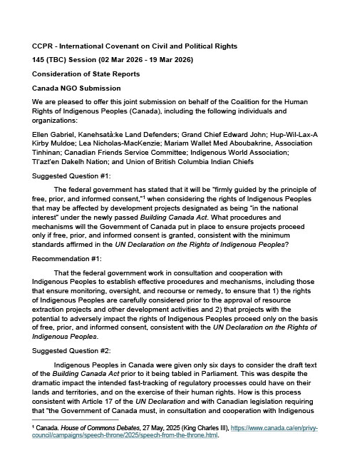 Queries for Canadian Friends on reconciliation. (2023) Video series What does sustainability mean to you? Advice for living our responsibilities. (2022) Podcast about what everyday non-Indigenous people in Canada can do toward reconciliation and relationship building. (2022) Fact sheet on Indigenous peoples and the United Nations Sustainable Development Goals. (2022) Fact sheet on the UN Declaration on the Rights of Indigenous Peoples and the UN Sustainable Development Goals. (2022) Video of Kanieke’ha:ke social worker Wanda Gabriel discussing intergenerational trauma and the UN Declaration. (2021) One-pager of films to help you learn about Indigenous cultures, rights, and historical and on-going colonialism. (2021) Report by the Global Indigenous Rights Research Network (which includes CFSC) on implementation of Indigenous rights. (2021) Backgrounder on self-determination and free, prior, and informed consent. (2021) Fact sheet correcting myths about implementing the UN Declaration. (Updated 2020) Fact sheet on free, prior, and informed consent. (2018) Fact sheet on interpreting the UN Declaration on the Rights of Indigenous Peoples. (2018) Resource to help Friends across Canada engage with the Calls to Action issued by the Truth and Reconciliation Commission. (2018) Analysis of the significant differences between ‘veto’ and ‘consent’. (Updated 2018) Annotated commentary critiquing fears raised about implementing the UN Declaration in Canada. (2018) Educational resource developed by KAIROS and several member churches seeking to implement the UN Declaration. (2017) Fact sheet on the United Nations Declaration on the Rights of Indigenous Peoples. (Updated 2017) Analysis of Indigenous peoples' human rights, the UN Declaration, and sustainable development in international law. (2017) Brief about the Truth and Reconciliation Commission of Canada. (2015) Joint report on Canada’s failure to resolve specific land claims. (2015) Analysis of why the UN Declaration is more than just “aspirational”. (Updated 2015) Brief on the Tsilhqot'in Nation decision and key connections to international law. (2014) Brief on resource development in western Canada and Indigenous peoples’ human rights. (2014) Factum to the Supreme Court of Canada on Tsilhqot'in Nation’s title case. (2013) Analysis of the UN Declaration’s provisions that are relevant to consent. (2013) Guided meditation to think about the meaning of home. (2001) Lecture on Quaker witness and testimony on aboriginal title and rights. (2001)Indigenous Peoples’ human rights